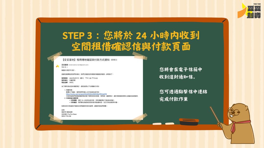 您將於 24 小時内收到空間租借確認信與付款頁面
